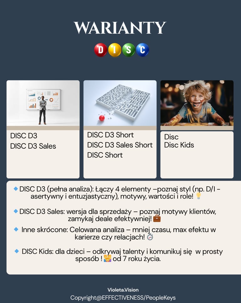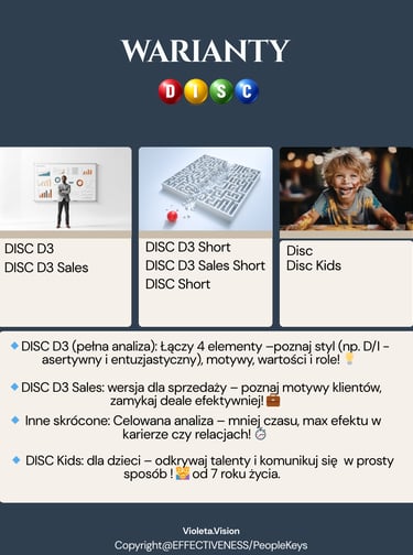 🔹 DISC: Twój styl komunikacji, decyzyjność, reakcja na stres i wartości dla zespołu – bądź gwiazdą w grupie!
